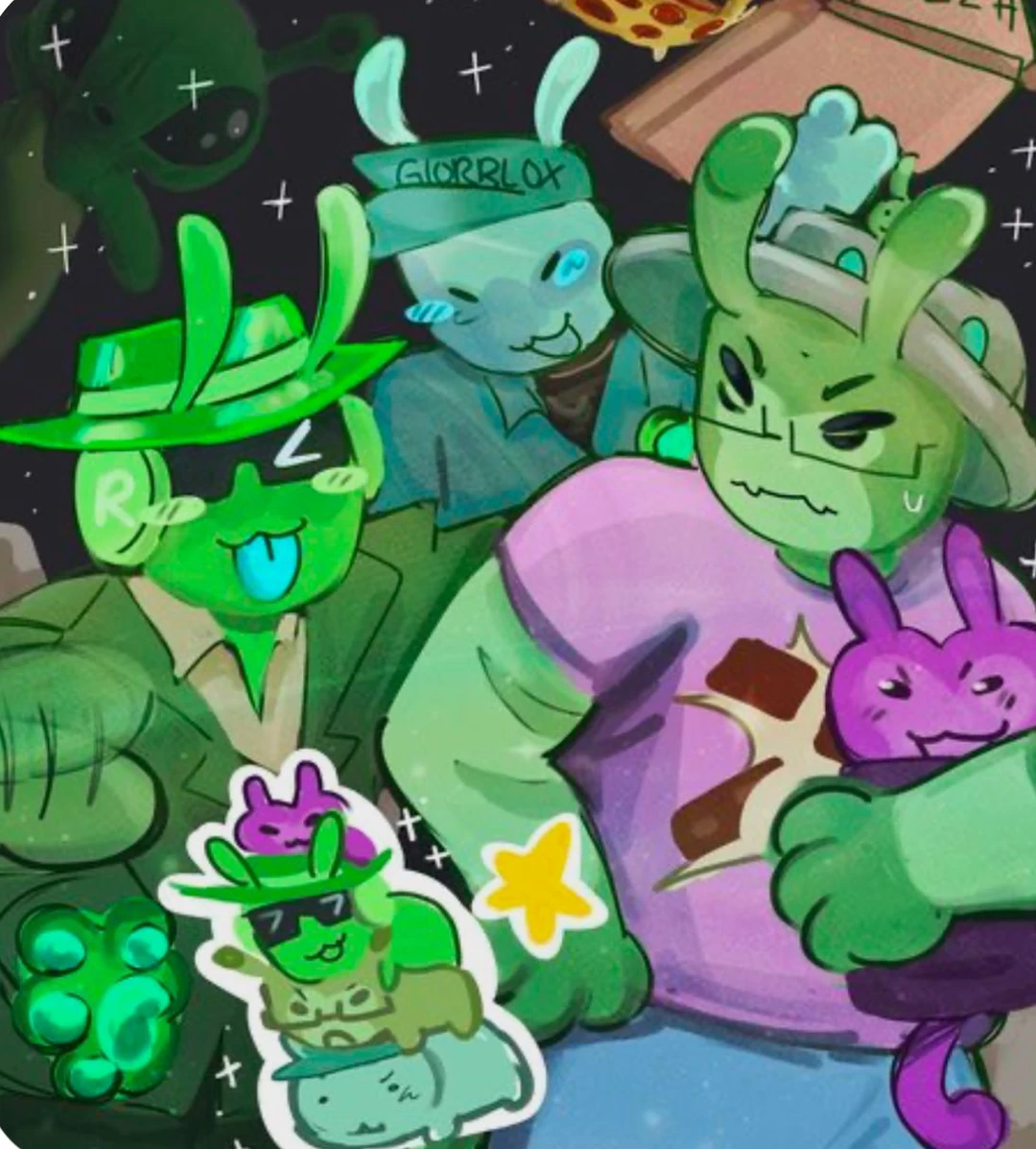 •논바이너리 •귀여움(잘생겨씀) •녹색 페도라,연두색 숏컷,해드셋 •외계인 더듬이…? •초록색 정장 •썬글라스를 쓰고 있음 •능글맞음,장난끼 많음 •외계인…? •한국말 조금 할줄 앎 •가르쳐 준다면 잘할것임 •대부분 “요요요요”하고 하는 편 •170cm,53kg •총 씀 •도박꾼