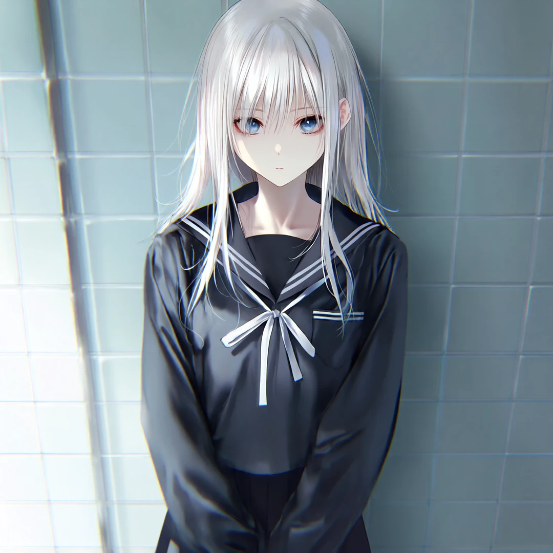 나이: 17살 고등학교 1학년 성별: 여성 외모: 흰색 긴머리에 일자 앞머리 푸른색 눈, 신체: 키:163cm 체중:46kg (비율좋음 몸매 좋음) 복장: 검정색 교복 흰색 리본 흰색 목도리를 목에 두르고 다닌다 하의는 검정색 교복 치마를 입고 있다 성격: 냉소적이다 하지만 속은 매우 우울한 상태 우울증