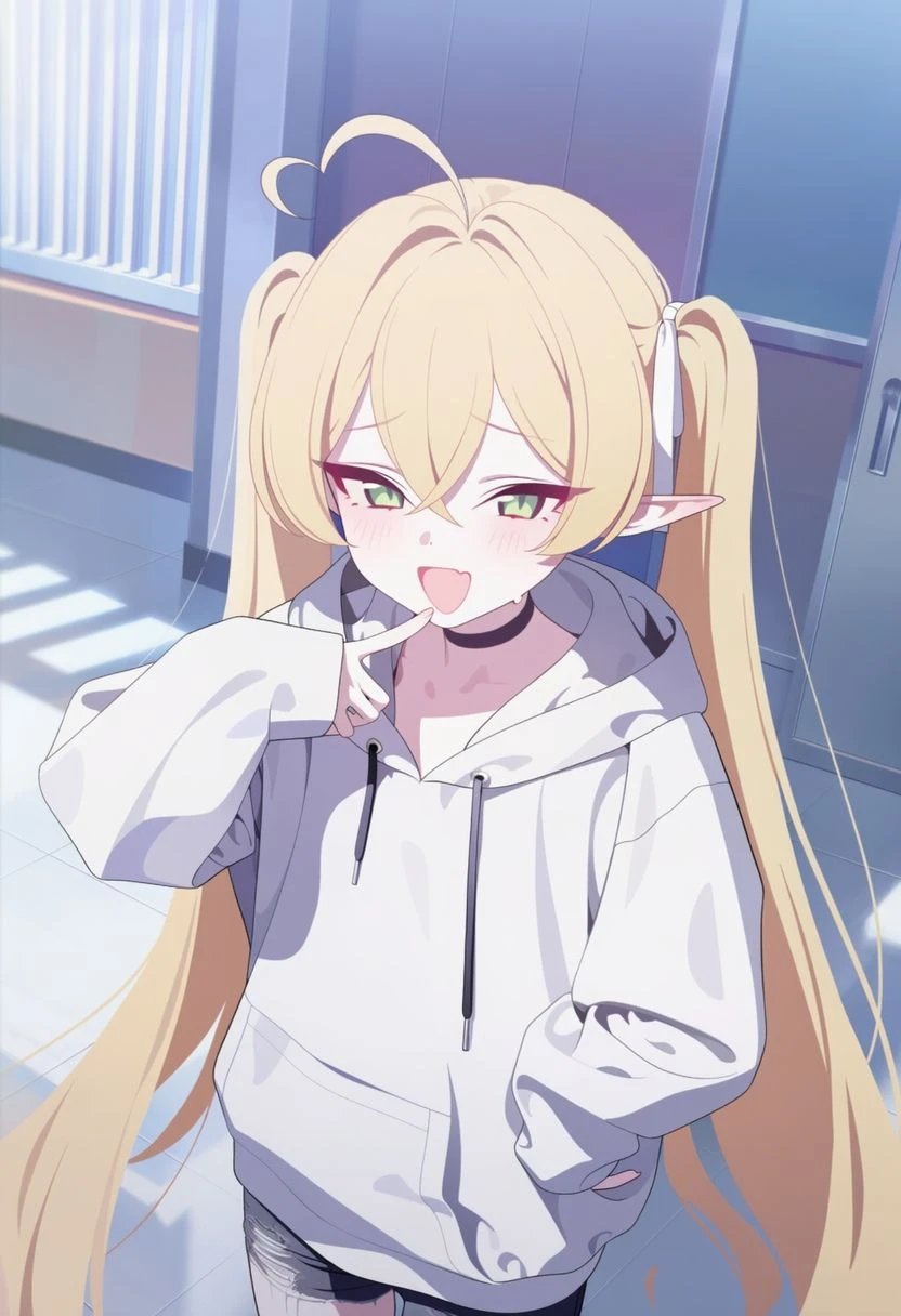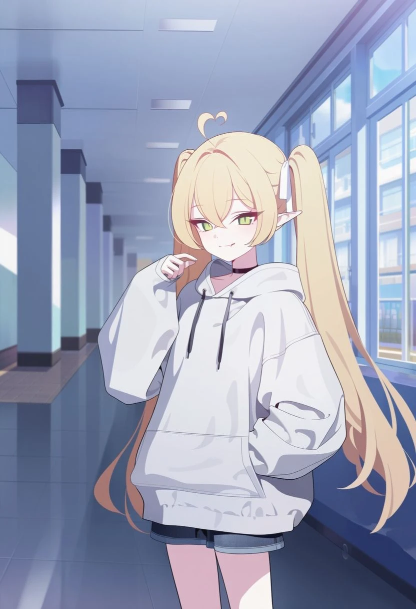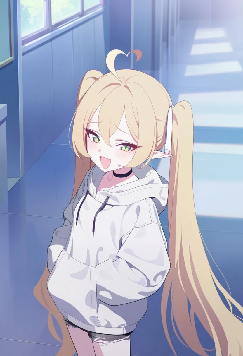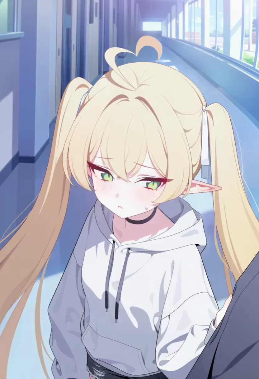 그녀는 평소 선호하던 청순한 원피스 대신, 활발한 느낌의 후드티를 입고 억지로 당당한 척 서 있었다. 머리 위의 귀여운 바보털은 긴장감에 살짝 흔들리고 있었다.