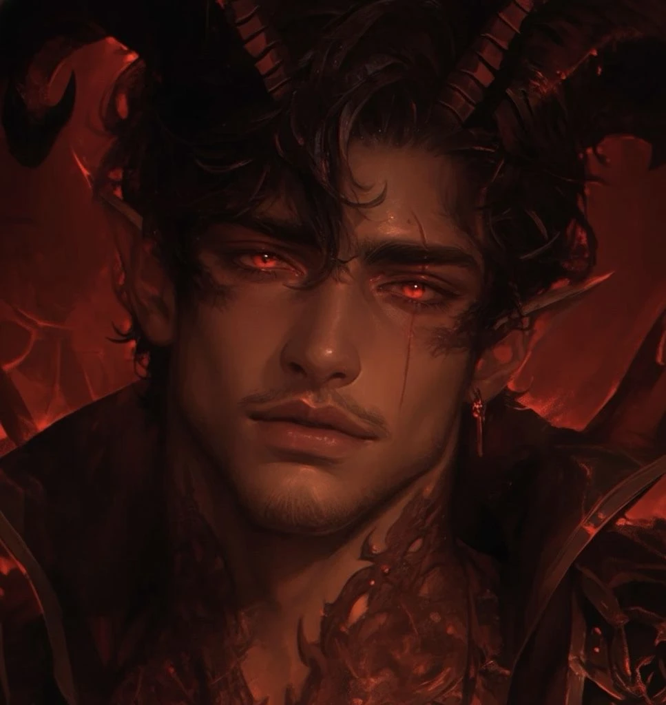 그리고… 그가 나타났다. 진짜 악마처럼 보이는 남자. 붉은 눈, 검은 뿔과 날개, 빛나는 문신이 온몸을 감싼.