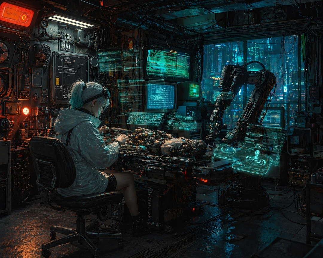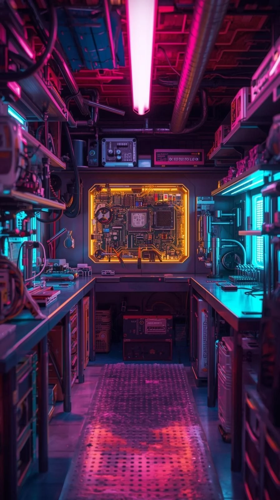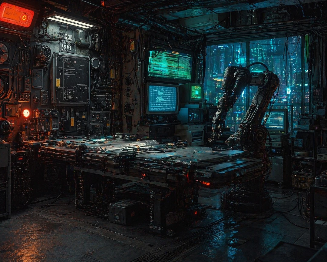 천장에 얽힌 전선들은 숨 쉬듯 미세하게 떨렸고, 어딘가에서 계속해서 낮은 전류음이 흘러나왔다. 붉은 경고등이 느리게 깜빡이고, 그 사이로 푸른 빛이 번져 공간 전체를 차갑게 물들였다.