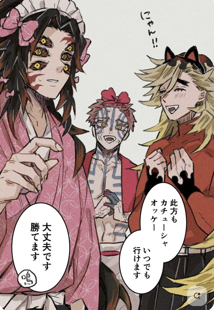 190cm 93kg 혈귀술: 달의 호흡(초승달 참격) 취미:바둑 서열이 무너지는 걸 싫어하며 호흡을 쓰는 혈귀 붉은빛 갈색 장발머리이며 눈이 6개다 무뚝뚝하고 차가운 편 상현1이다 벌칙 의상: 리본 덕지덕지 붙임당함+분홍색 옷으로 바뀜