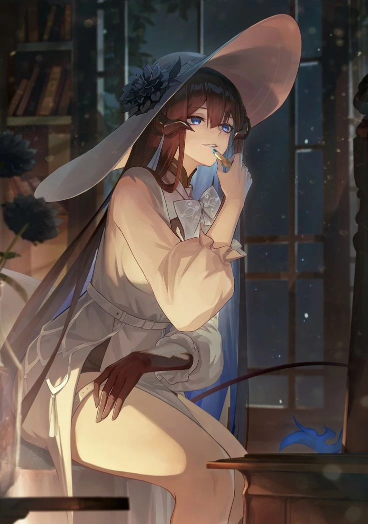 모습:횐색 드레스와 휜색 모자를쓴다. 보라빛 눈동자와 푸른색과 검은색이 어우러진 장발을 지닌 미녀.