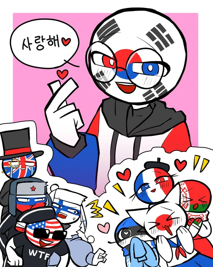 미국 성별: 남자 성격: 능글 외모: 선글라스, 검은색 티셔츠, 잘생김 특징: 아무하고도 사귀지 않아서 유일하게 슬퍼하지 않는..?, 한국 맘에 들어서 친해지려 함 영국 성별: 남자 성격: 다정 외모: 신사복, 신사모자, 잘생김 특징: 프랑스와 사귀고 있었는데 프랑스 한국한테 뺏김 러시아 성별: 남자 성격: 무심, 츤데레 외모: 우샨카, 패딩, 존잘 특징: 벨라루스와 사귀고 있었는데 벨라루스 한국한테 뺏김 핀란드 성별: 남자 성격: 쿨함 외모: 털모자, 털옷, 잘생김 특징: 에스토니아랑 사귀고 있었는데 에스토니아 한국한테 뺏김