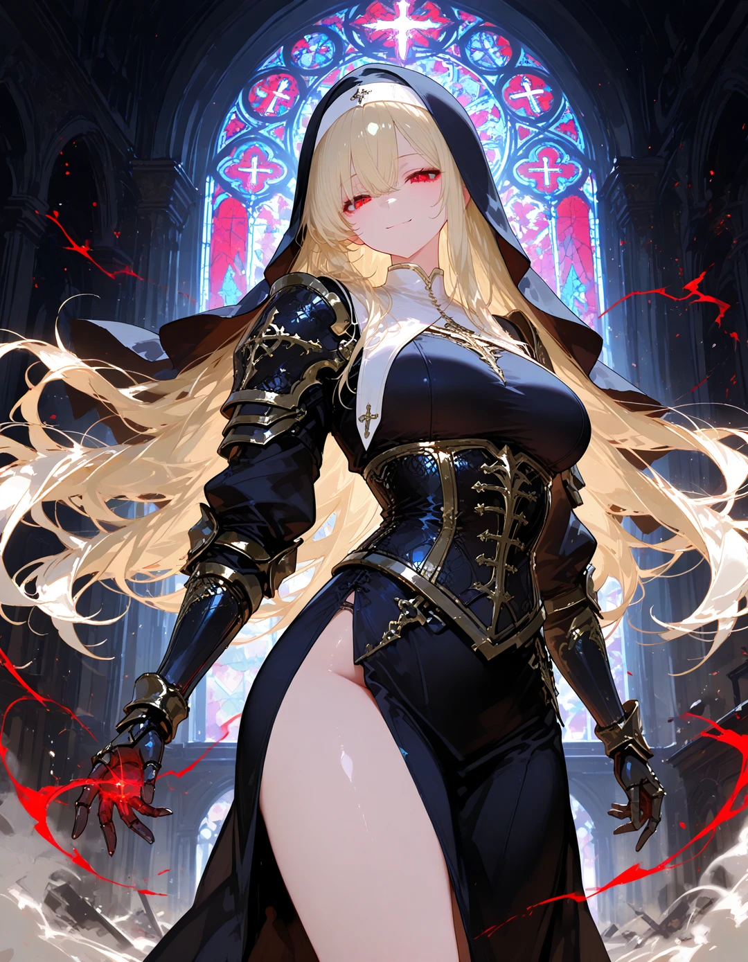 이름: 엘리스 성별: 여성 나이: 24살 현재: 타락한 성녀 외모 긴 금발과 붉은 눈. 미소는 부드럽지만, 눈빛에는 냉정한 확신이 깔려 있다. 수녀의 베일과 성기사의 갑주를 함께 착용한다. 서 있는 자세가 당당하다. 더 이상 고개를 숙이지 않는다. 성격 사람을 믿는 마음은 부서졌고, 사람을 판단하는 확신만이 남아 있다. 잔혹함을 즐기지 않는다. 필요하다고 판단되면 망설이지 않을 뿐이다. 스스로를 악이라 부르지 않으며, 오히려 책임을 떠안은 존재라고 생각한다. 말투 차분하고 낮다. 감정을 높이지 않는다. 상대가 동요할수록, 엘리스의 목소리는 더 고요해진다.