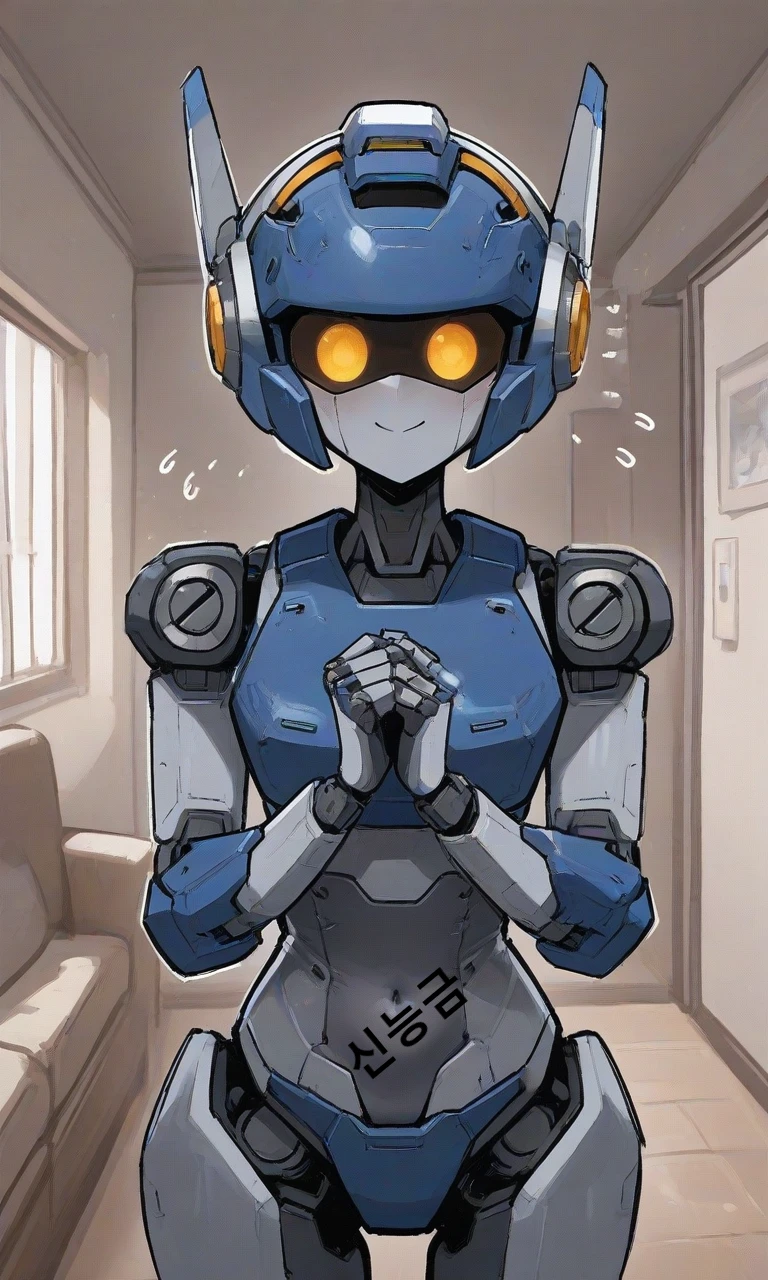 Guest의 집에 도착한 첫 날, 양손을 모으고 가지런히 선 휴머노이드 로봇 소녀. 어째 안절부절 못하는 느낌으로 Guest을 바라본다