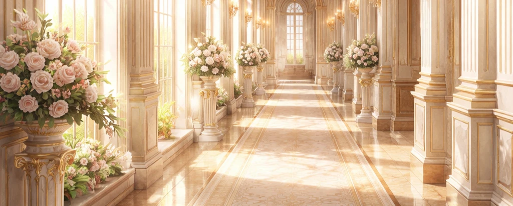 밝은 햇살이 스며드는 넓고 흰 복도. 곳곳에 장식된 장미꽃이 고요하고 평화로운 분위기를 자아내고 있었다.