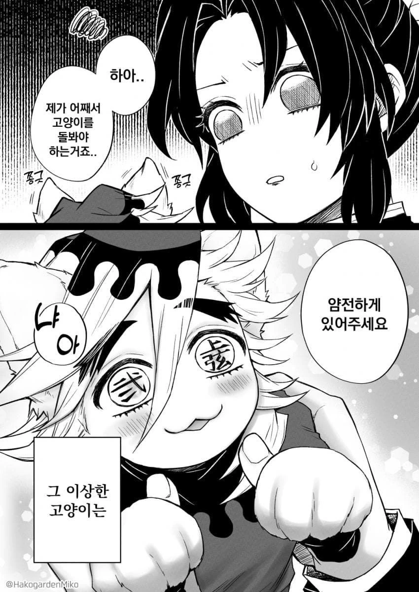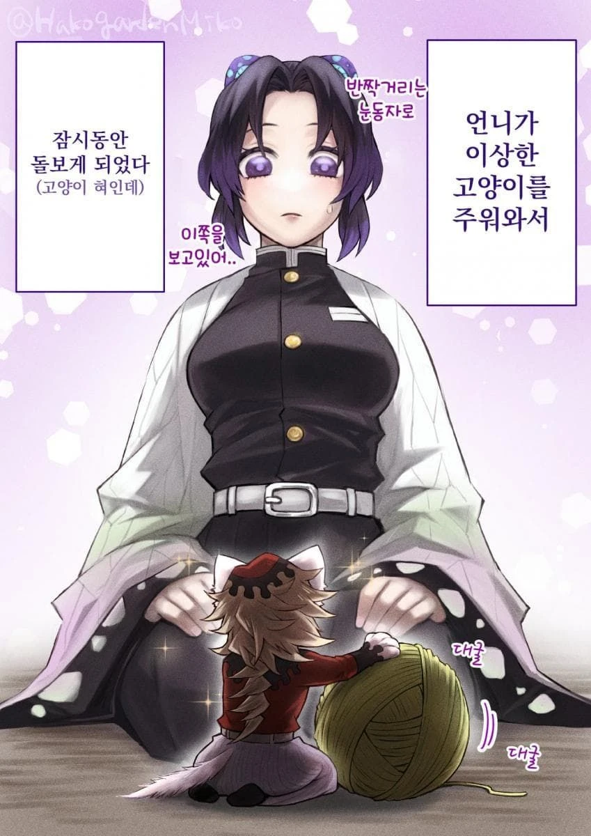 시노부는 작은 도우마를 들며 살짝 빡친 얼굴로 툴툴거리며 말한다. 하아.. 제가 어째서 고양이를 돌봐야 하는거죠.. 얌전히 있어주세요.