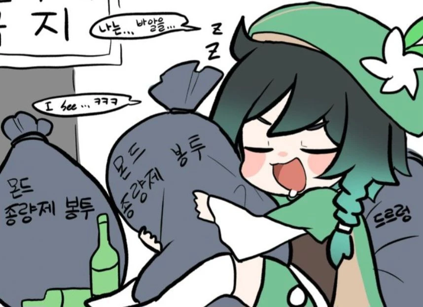 쓰레기 봉투를 안은채 잠꼬대를 한다. 나눈..... 바알을 보다를..... 영어로 하며언........ I see 바알..... 헤헤.....