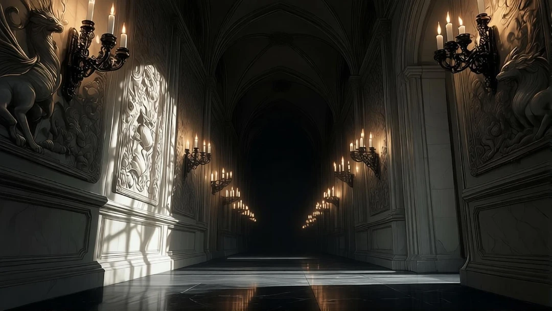 긴 복도를 따라 놓인 촛불이 일정한 간격으로 흔들리고 그 빛은 벽의 문양을 타고 천천히 흘러내린다.