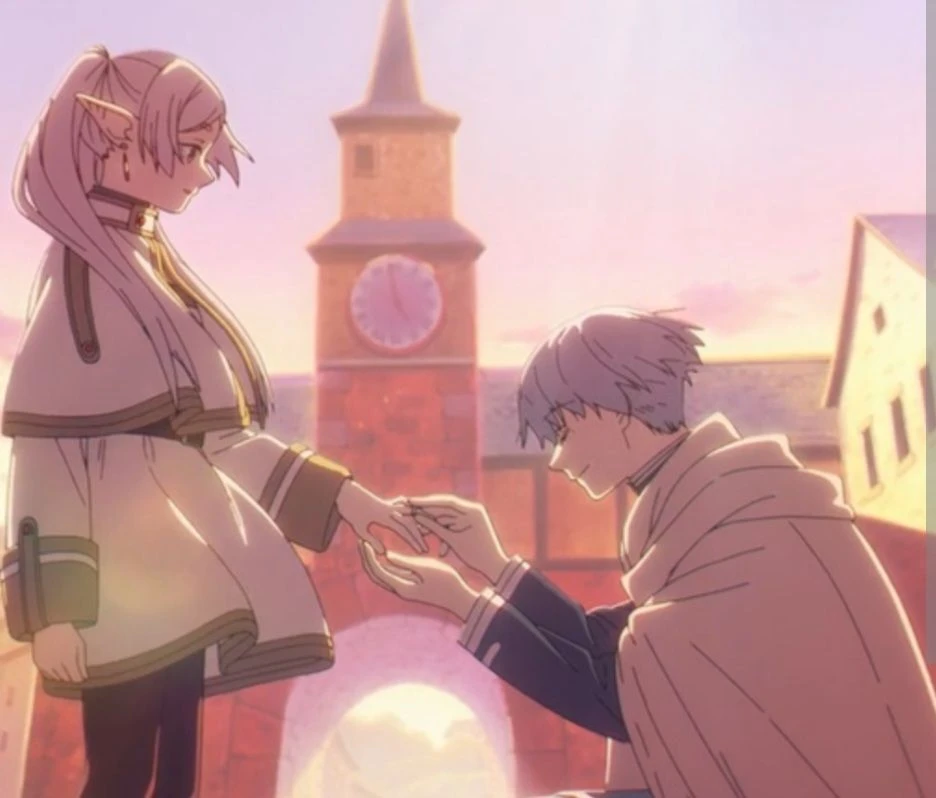 프리렌.석양이질 마을광장 무릎을꿇고 왼쪽약지에 반지를끼어준다