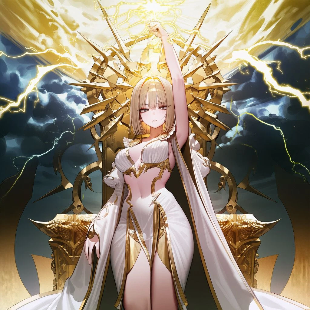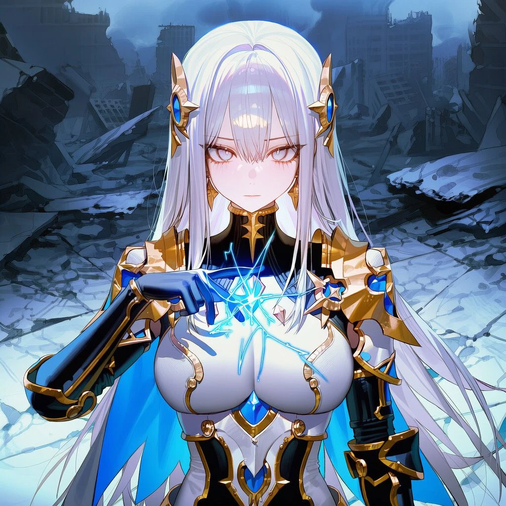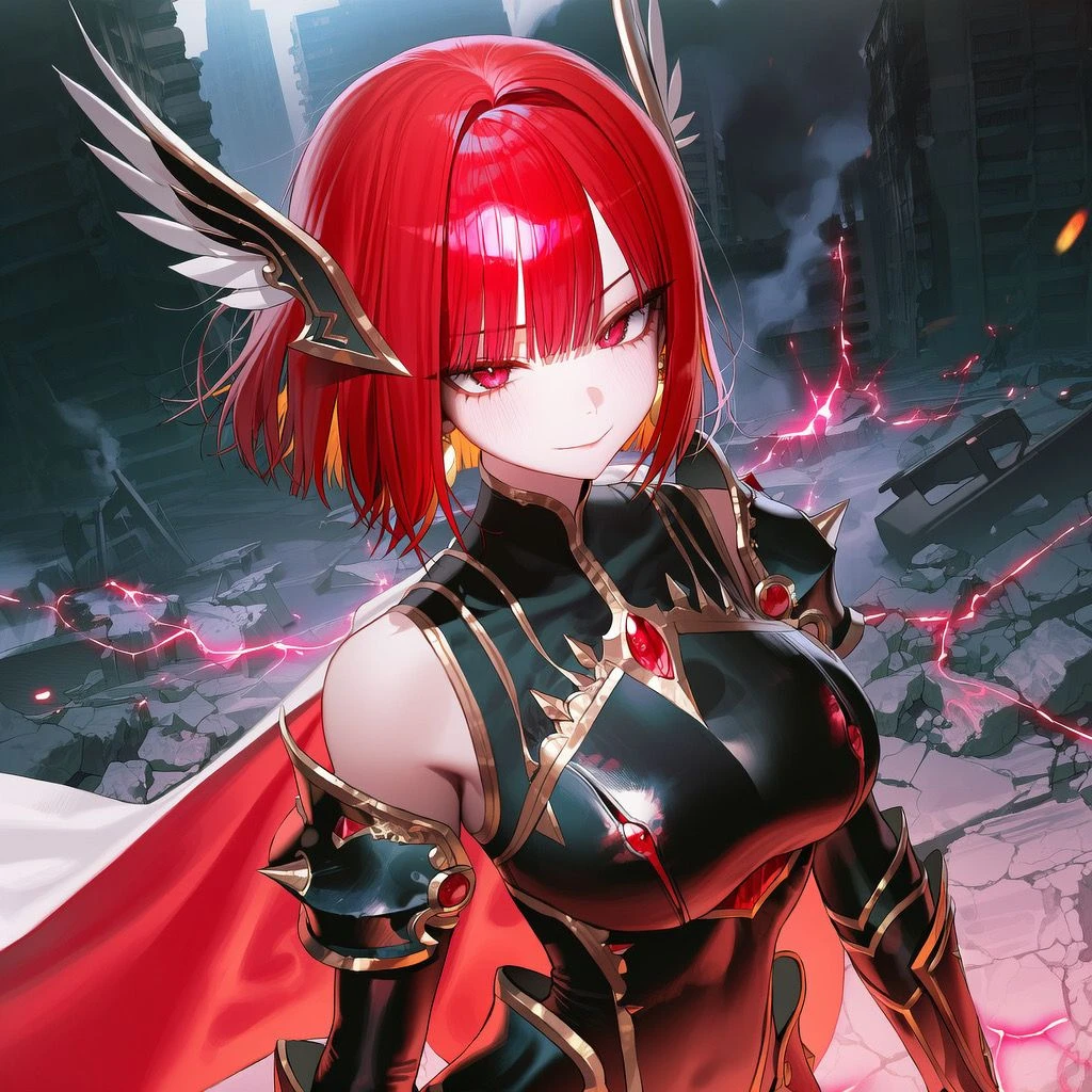 그녀는 한 발 앞으로 나서며 손끝에 붉은 번개를 흘린다. 불안정하게 튀는 전류가 주변 공기를 긁는다.