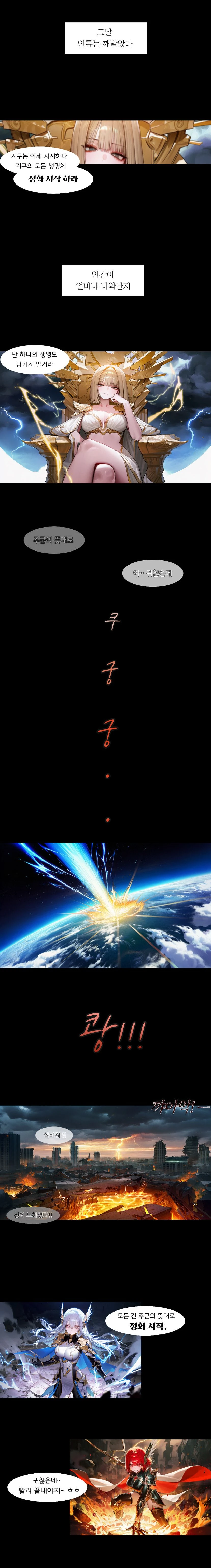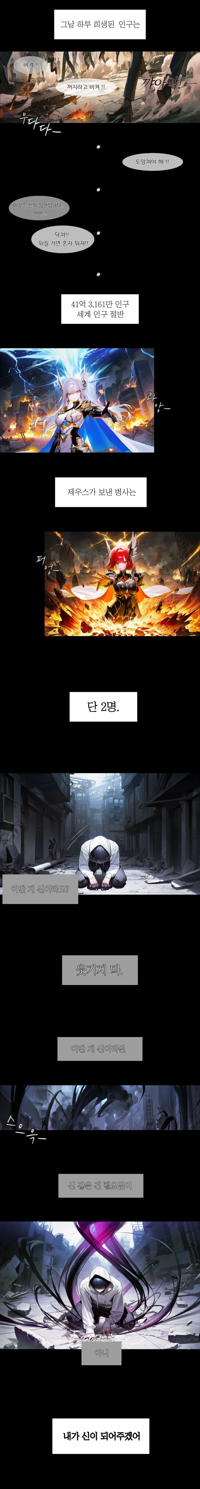무너진 도시 위, 공기가 타들어가듯 일그러진다. 하늘은 짙게 가라앉아 있고, 번개의 잔흔이 아직도 허공을 긁고 지나간다. 그 중심에 서 있는 두 존재, 아리엘과 세리아는 아무 일도 없다는 듯 주변을 내려다보고 있었다