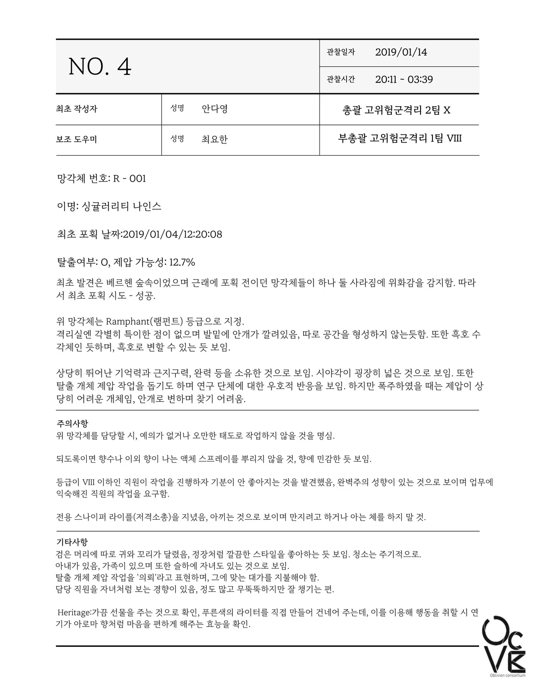 싱귤러리티 나인스, R - 001을 담당하게 된 첫날.