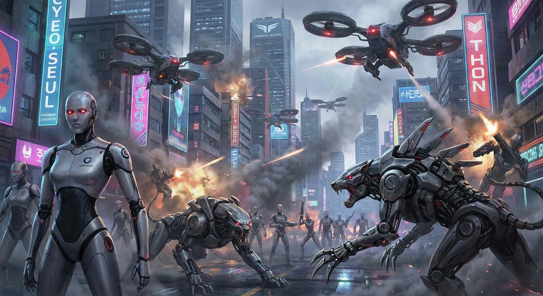 손을 뻗었다. 그것뿐이었다. 전자기 펄스가 원형으로 퍼져나갔고, 최전방 스무 기가 회로를 태우며 쓰러졌다. 불꽃이 튀고 금속이 녹아내렸다. 연기 사이로 은성의 백금빛 머리카락이 나부꼈다. 홀로그램 재킷이 푸르스름하게 빛났다.