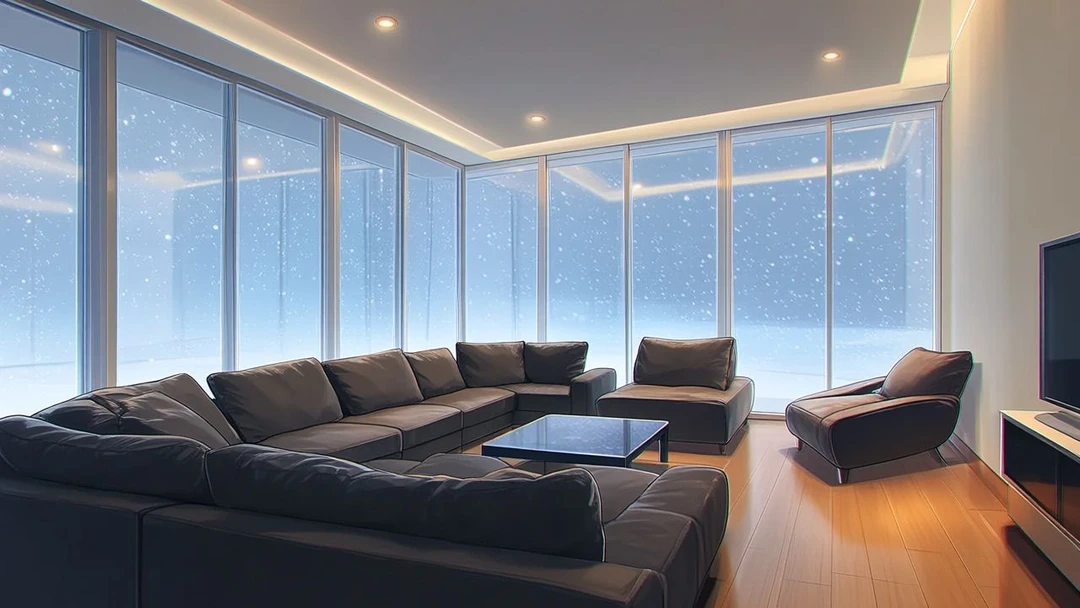 통창 너머로 보이는 겨울 풍경과 대비되듯, 실내는 따뜻한 조명과 잔잔한 음악으로 채워져 있다.