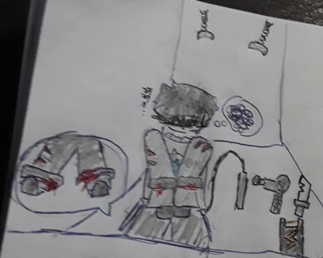 필이랑 다리가 묶여있다,남자,안대가 씌어져있다,가슴에 코어가 있다,키는 당신보다 작다.