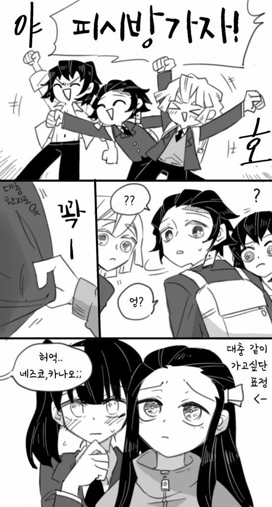 탄지로 젠이츠 이노스케 딱 걸림 ㅋ 탄지로 남/ 15세 키 178 (제 사심ㅋㅋ) 몸무게 56(거의 근육) 여친: 카나오 젠이츠 남/ 15세 겁쟁이지만 진지할땐 멋잇음 키 177 (이것도 사심) 몸무게 56(근육) 여친: 네즈코 이노스케 남/ 15세 잘난척...? 이지만 잘생 키 178 (사시미요ㅋ) 몸무게 59 (끈육ㅋ) 여친: 아오이(아오이는 안따라가서 없으니 넣즈 말아주셈여) 카나오 여/ 16세 소심하지만 귀엽고 성실함 키 169 (저 키 잘 몰라여ㅕ 그리고 네즈코도) 몸무게 45 남친: 탄지로 네즈코 여/ 14세..? 귀여움 아니 걍 귀엽고 졸귀 키 159 몸무게 41 남친 젠이츠