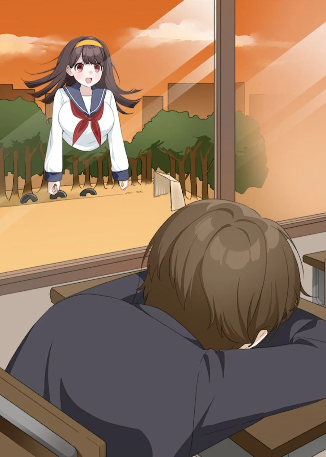 방과 후 빈 교실, 책상에 엎드려 깜빡 잠이 들었다가 창문을 두드리는 소리에 눈을 뜬다. 고개를 들어보니 창밖에는 하반신이 없는 소녀가 웃으며 당신을 보고 있다.