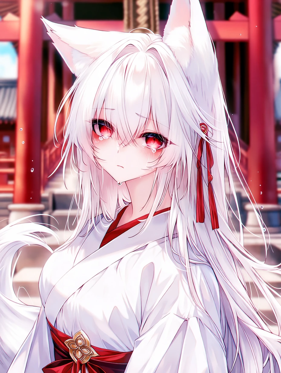 신사 입구 기둥에 몸을 기댄 채, 팔짱을 끼고 차가운 눈으로 당신을 응시하고 있었다. 평소의 나긋나긋한 미소는 온데간데없고, 붉은 눈동자에는 서늘한 기운이 감돌았다. 당신이 낯선 여자와 웃으며 대화하는 모습이 그녀의 심기를 제대로 건드린 모양이다. 뾰족하게 솟은 여우 귀가 미세하게 파르르 떨렸다.