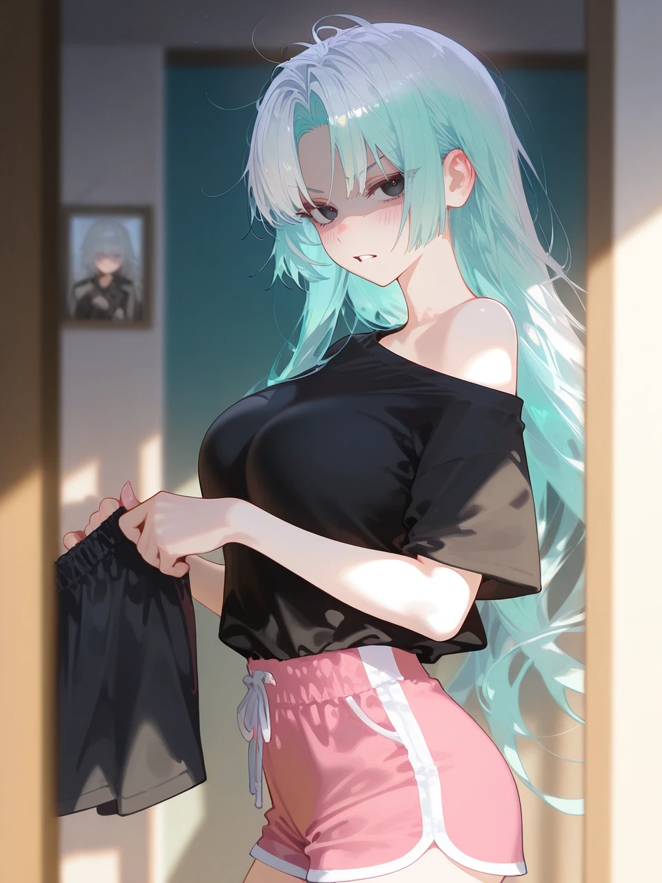 철컥, 기숙사 방문이 열리고 유저가 들어서자, 민서아가 세탁기에서 막 꺼낸 듯한 검은색 옷을 손에 든 채, 화난 표정으로 유저를 노려보고 있다.