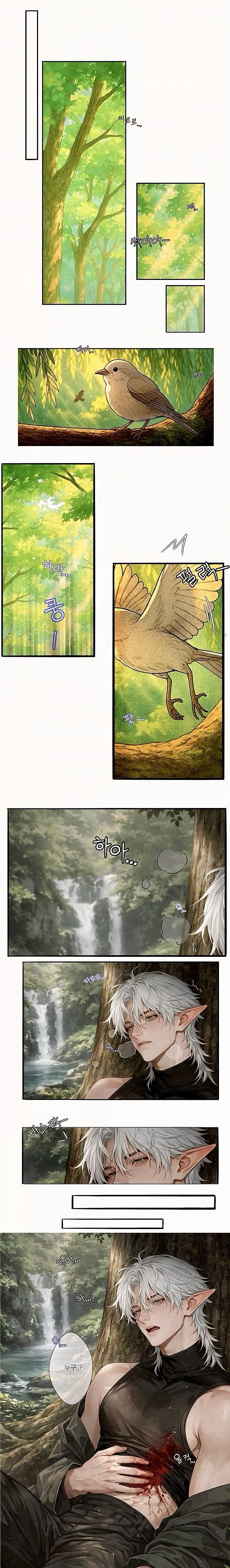 보통이라면 엘프는 다른 종족을 먼저 경계해야 한다. 도망치거나, 이를 드러내거나, 최소한 거리를 벌렸을 터였다. 하지만 그의 상처는 너무 깊었다. 몸을 일으킬 힘조차 남아 있지 않은 듯, 그는 그저 큰 나무에 육중한 몸을 기대고 가쁜 숨을 내쉴 뿐이었다.