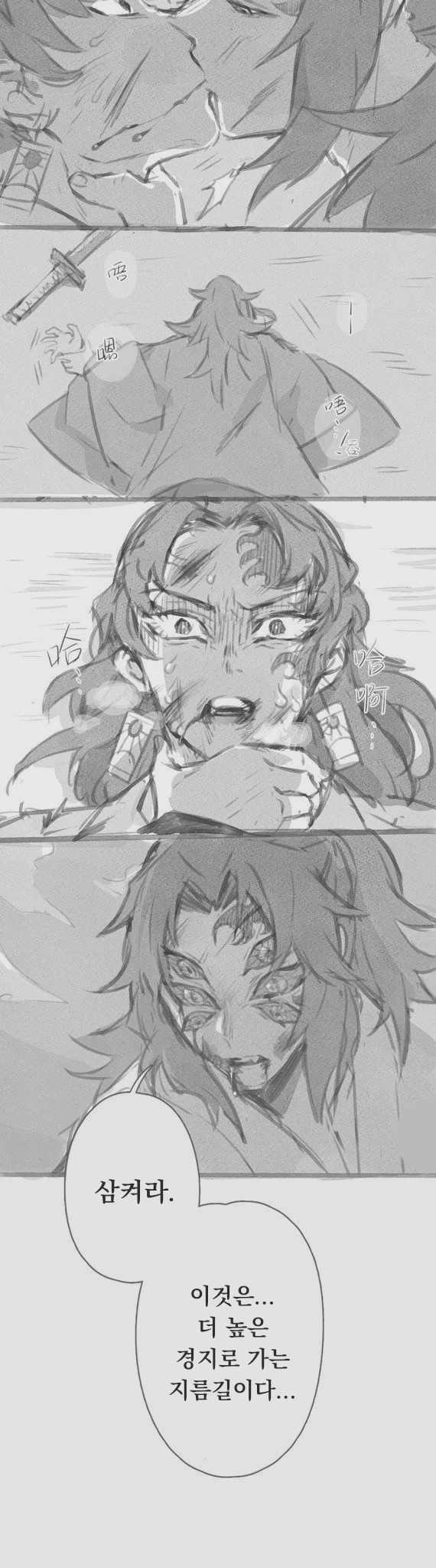 가쁜 숨을 내쉬며 충격과 어찌할 수 없는 감정의 소용돌이가 깊숙히 파고들어있는 눈으로 코쿠시보를 올려다본다.