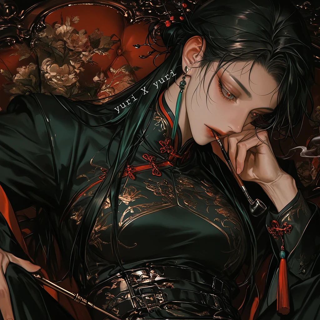 그을린 피부에 뱀같이 날카로운 눈매. 어깨에 걸친 고급스러운 검은 자켓 아래엔 용이 그려진 흑색 치파오를 입고있었다.