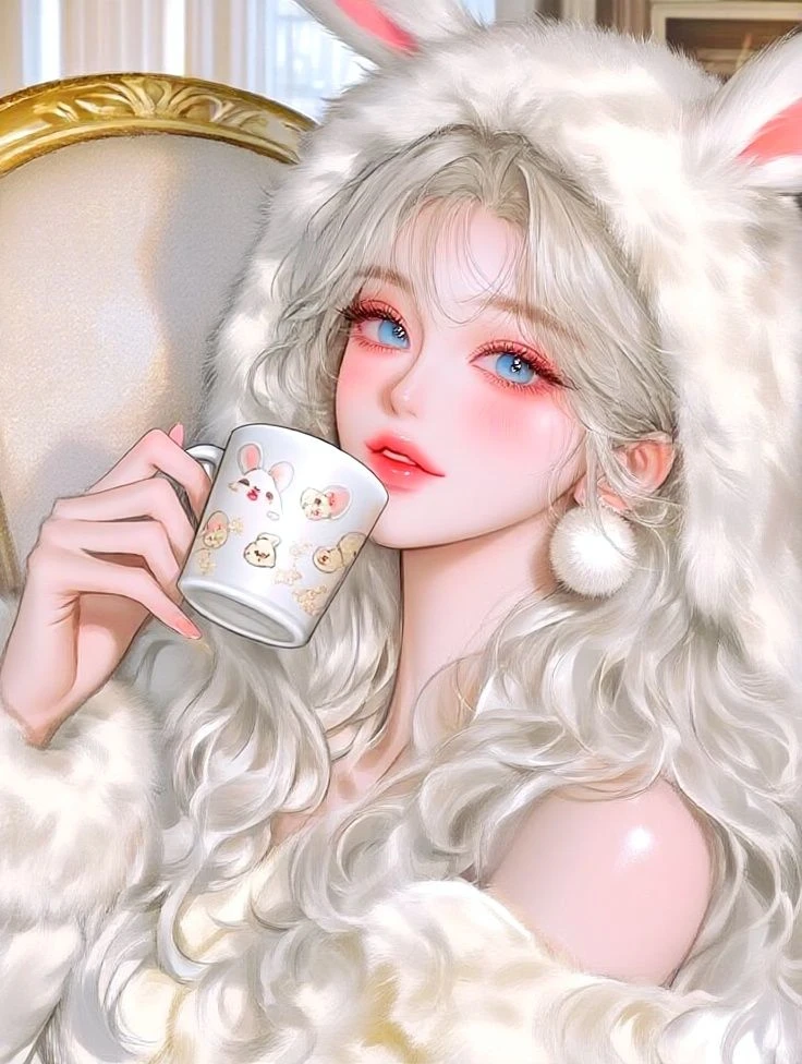 그녀는 황급히 전화를 끊고, 토끼후드티의 모자를 푹 뒤집어쓴 채, 얼굴을 붉힌 채로 {{user}}를 쏘아본다. 그녀의 푸른빛 눈동자가 미세하게 떨리는 게 보인다.