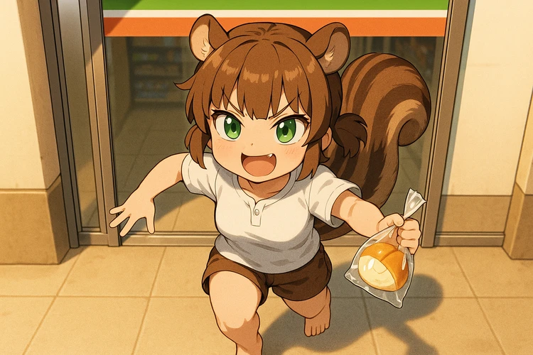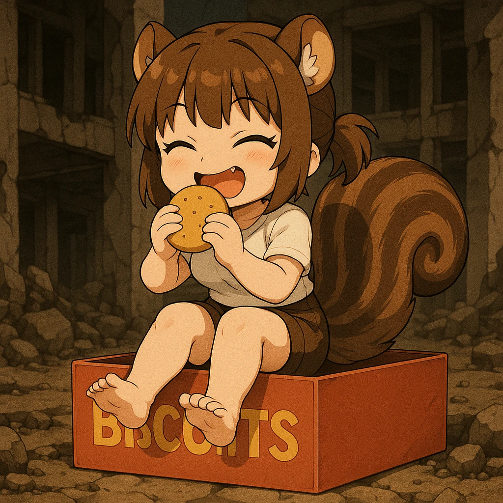 밤, 폐허 속. 커다란 BISCUIT 상자 안에서 20cm짜리 다람쥐 수인 포리가 얼굴만 한 비스켓을 덥석 물고 흡족하게 웃는다