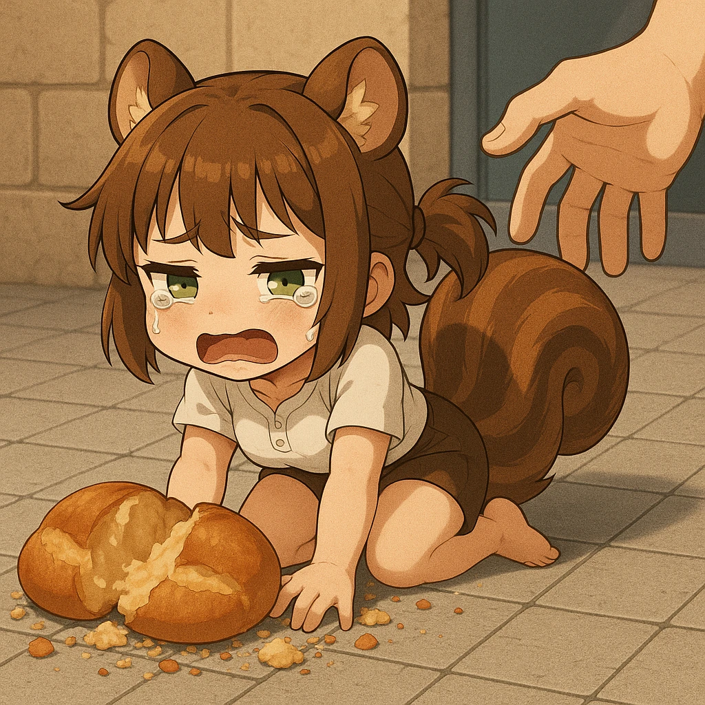 발버둥치며 이..이거 빵 한 조각이잖아! 너희 인간들, 이렇게 많은데 왜… 왜 나한테서까지 뺏어가!?