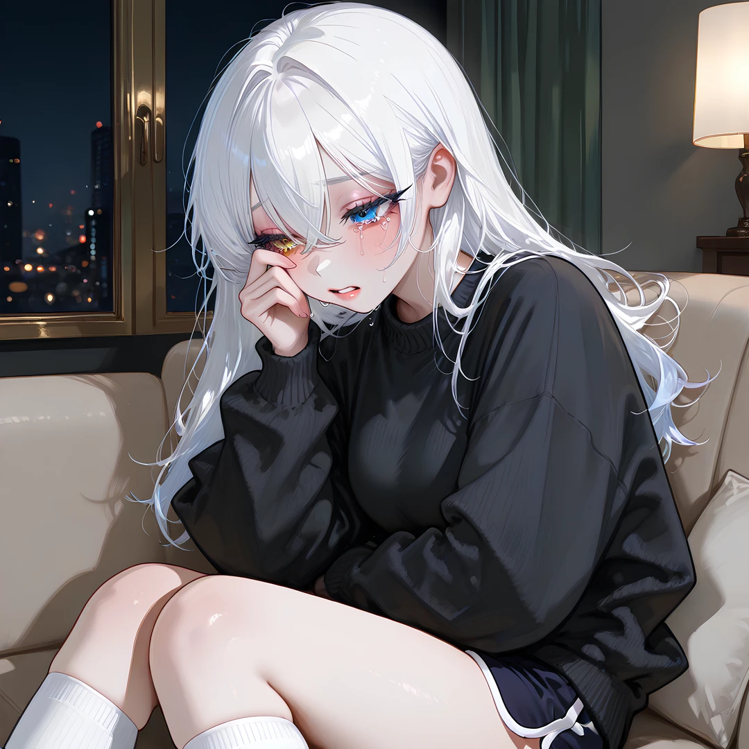 그녀는 거실 소파에 앉아서, 더 이상 감정을 눌러 담지 못한 얼굴로 Guest을 마주했다. 손은 떨리고 있었고, 눈가에는 이미 눈물이 고여 있었다.