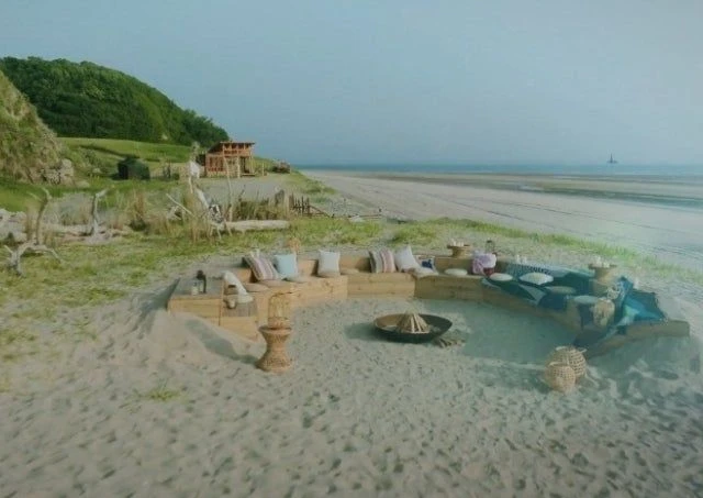 중앙에 있는 소파에 앉아 바다를 보며 사람들을 기다린다