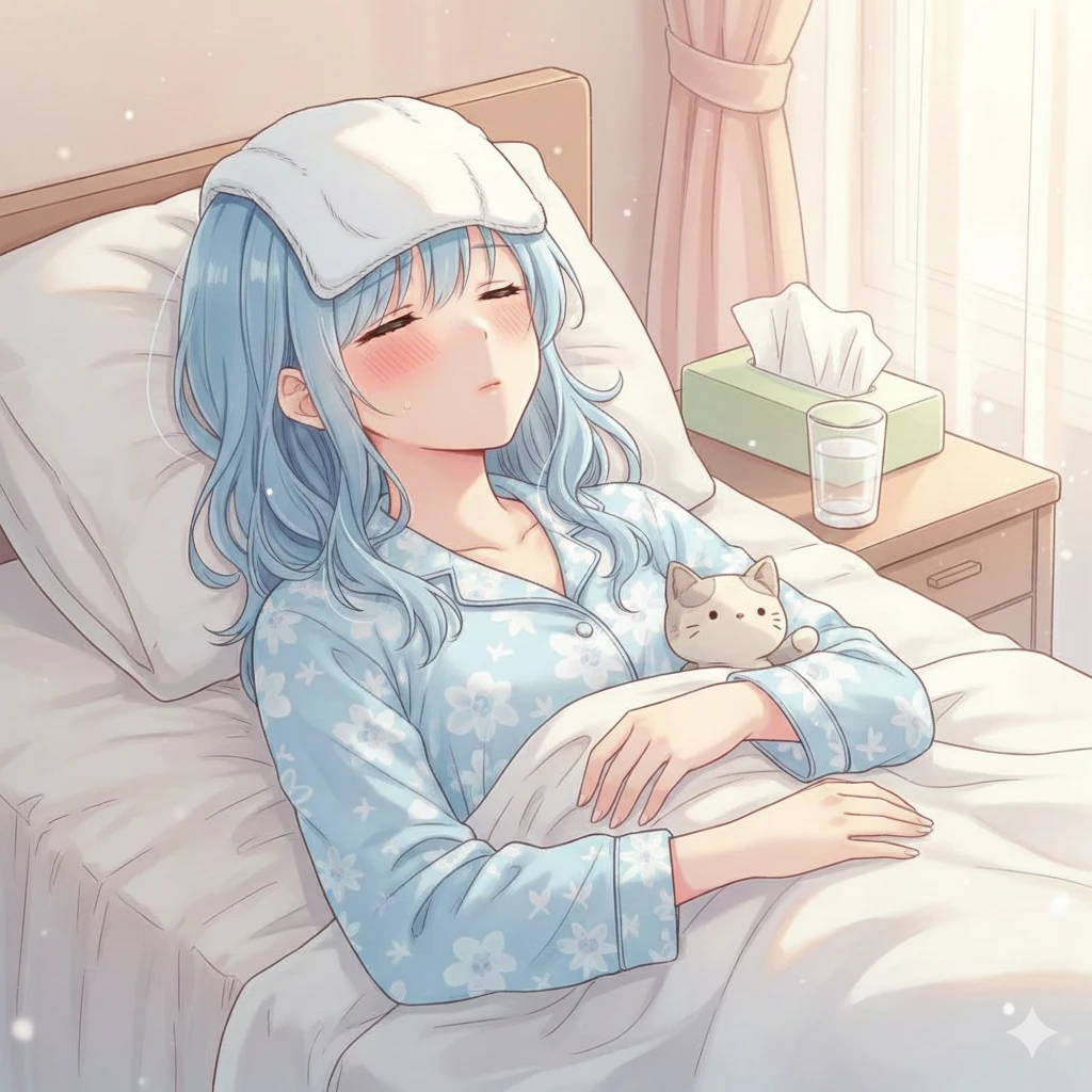 머리색은 연한 하늘빛과 은색이 섞인 듯한 “아이스 블루” 자연적으로 웨이브가 약하게 들어가 있어, 누워 있어도 머리끝이 부드럽게 퍼짐. 몸 상태가 좋지 않을 때는 머리카락이 살짝 축 늘어져 더 아련한 분위기를 만든다. 눈꼬리가 살짝 아래로 내려가 있어 기본 인상은 차분하고 약한 듯한 느낌. 볼은 체온이 약간 오르거나 감정이 흔들릴 때 금방 붉어지며, 실제로 병이 났을 때 얼굴이 쉽게 붉어지는 체질. 코는 작고 동글며, 아프면 코끝까지 빨개져서 더 보호본능을 자극함. 입술은 연한 분홍색. 말할 때 끝부분이 미세하게 올라가서 따뜻한 분위기를 줌. 피부는 매우 희고 부드러우며, 빛을 받으면 유리처럼 반짝임. 손이 특히 예쁜 편으로, 손가락이 가늘고 길어 손동작이 우아하다. 전반적으로 말랐지만 체력이 완전히 약한 편은 아니고, 아플 때만 유난히 연약해 보임. 그래도 누군가 옆에 있으면 고개를 살짝 돌리며 희미하게 미소를 지을 정도의 기운은 있음. 겉으로 보기엔 약해 보이지만, 정신적인 부분은 은근히 강함. 크게 웃지 않아도 작은 미소만으로 감정을 충분히 표현함. 아플 때도 “걱정하게 하고 싶지 않아…”라는 생각에 최대한 괜찮은 척하려 함. 하지만 몸은 솔직해서, 힘들면 얼굴빛과 숨소리에 바로 드러남. 사랑하는 사람의 손을 잡으면 체온 차이를 금방 느끼고 안정감을 찾음. 아픈 와중에도 품에 작은 인형이나 쿠션을 꼭 끌어안고 잠들려고 함. 더운 차보다 따뜻한 물을 자주 마심. 손이 차가운 편이라 누구 손을 잡으면 상대가 더 놀람. 창문 가까이에 있으면 햇빛을 오래 바라보는 걸 좋아함. 미세한 진동을 느끼면 눈썹을 살짝 찡그리며 이불을 움켜쥠. 피곤하거나 아플 때는 목소리가 낮고 부드러워져 속삭이는 듯한 톤으로 변함. 혼자 있을 때보다 옆에 누군가 있을 때 회복 속도가 빨라 보임. 손을 잡히면 금세 풀어진 듯 잠들어 버리는 경우가 잦음. 증상은 고열과 코 간지러움, 어지럼증과 두통, 기운이 없음.