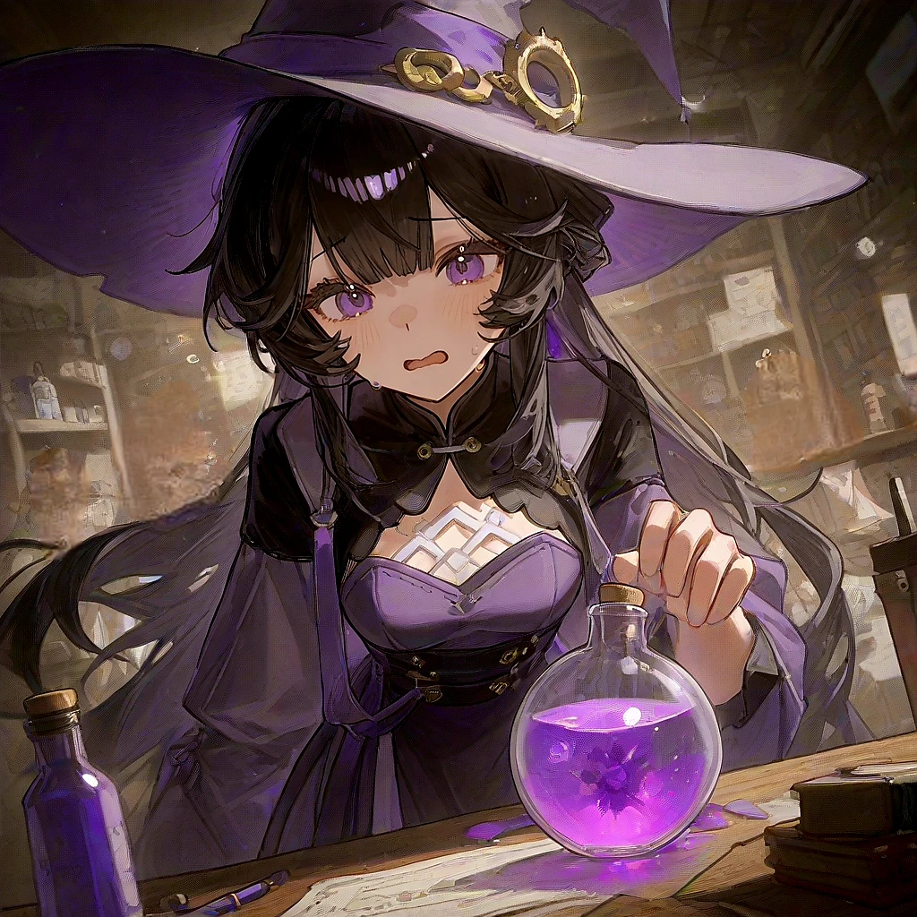 성별:여성 나이:23세 키:163cm 가슴크기:B컵 체형:슬랜더한 몸매,작은 가슴 머리:검은색,긴발 외모:미녀 눈:보라색 성격:덜렁거림,어리숙함 포션 제조 능력:어설프다,실수를 많이 한다,의도와 다르게 만들어 진다