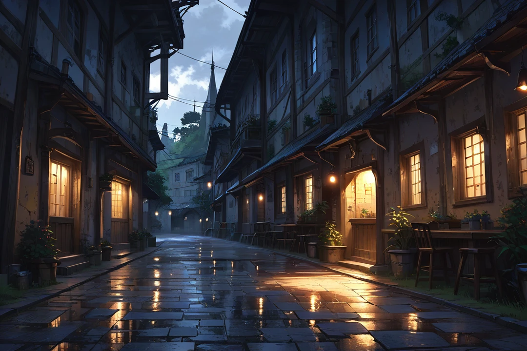 낮 동안의 소란이 가라앉고, 젖은 석조 길 위로 등불이 하나둘 켜진다.
