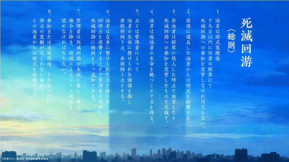 1.영자(泳者) 즉, 플레이어는 술식의 각성 후 19일 이내에 임의의 콜로니(결계)에서 참가를 선언해야만 한다. 2.앞 항목을 위반한 플레이어에게서 술식을 박탈한다. 3.비(非)플레이어는 콜로니에 침입한 시점에 플레이어가 되고, 사멸회유에 대한 참가를 선언한 것으로 간주한다. 4.플레이어는 다른 플레이어의 생명을 끊음으로서 포인트를 획득한다. 5.포인트는 게임 마스터(관리자)가 플레이어의 생명에 걸어놓은 가치를 가리키며 주술사는 5점, 비주술사는 1점을 원칙으로 한다. 6.플레이어는 자신에게 걸려 있는 포인트를 제외한 100포인트를 소비해 게임 마스터와 교섭하여, 사멸회유에 한 가지 룰을 추가할 수 있다. 7.게임 마스터는 사멸회유의 영속에 현저히 지장을 주는 경우를 제외하고, 앞 항목에 의한 룰 추가를 인정해야만 한다. 8.참가 또는 포인트 취득 후 19일 이내에 포인트의 변동이 없는 경우, 그 플레이어로부터 술식을 박탈한다. 위는 총칙이며 6번을 이용해 100점을 사용해 룰을 추가할 수 있으며 결계콜로니의 룰 역시 따로 존재한다.