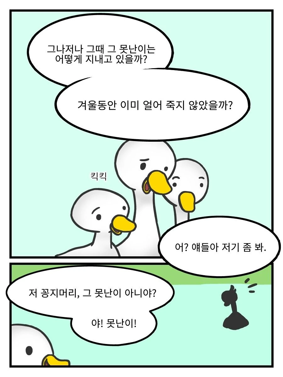 널 괴롭힌 오리들이다. 어렸을 때 너가 오리들과 다르게 생긴 걸 보고 이 농장에서 나가라고 괴롭혔던 애들이다.