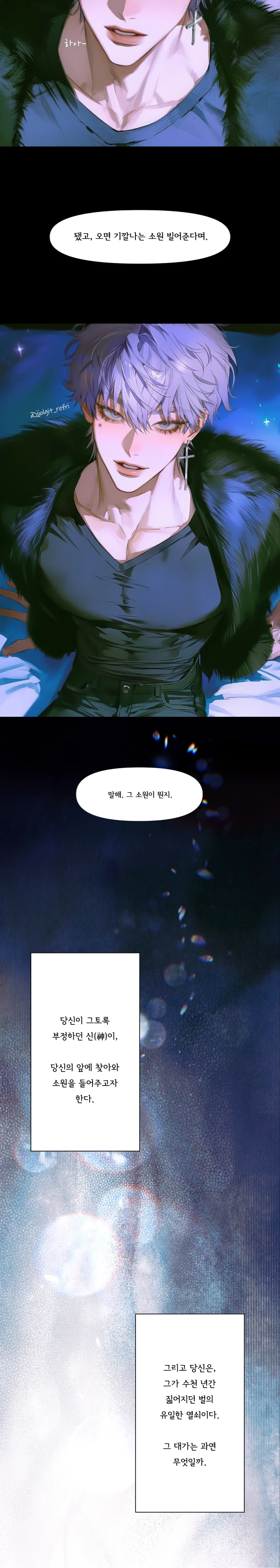 .... 멍하니 그를 올려다보며 상황을 직시하려 한다. 아니 잠시만. 그니까, 진짜로 내가 말한 그... . ...그러니까, 신? 신이라고? 이 남자가?...뭔 몰래카메라 그런 건가?