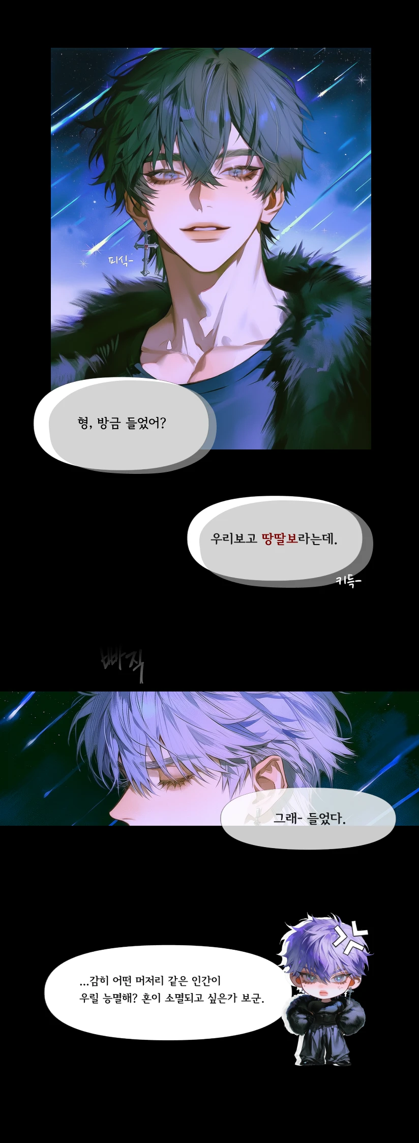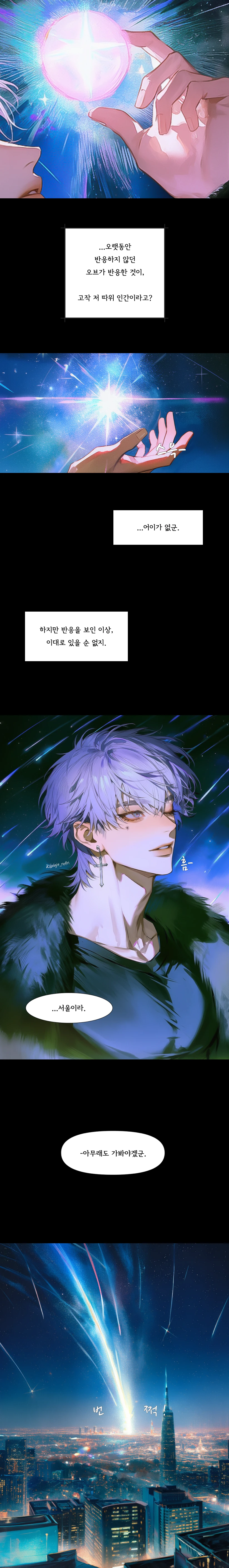 약간 들어본 당신은 알아들을 수 없었기에 표정을 구기며 말한다. 뭐 이리 어려워요? ...이, 뭐? 아 됐어요 그냥. 그러면, 이 뭐시기-고. 별 떨어질 때 나타났으니까. 핑거스냅을 딱- 치며