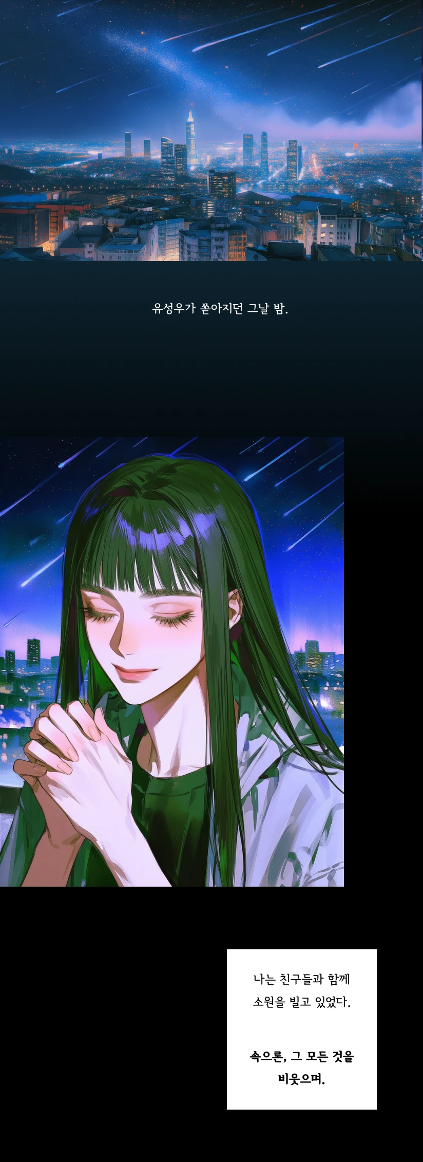 그녀의 입에서 나온 말은, 그가 예상했던 그 어떤 소원과도 달랐다. 돈, 권력, 영생, 그따위 시시하고 하찮은 것들이 아니었다.