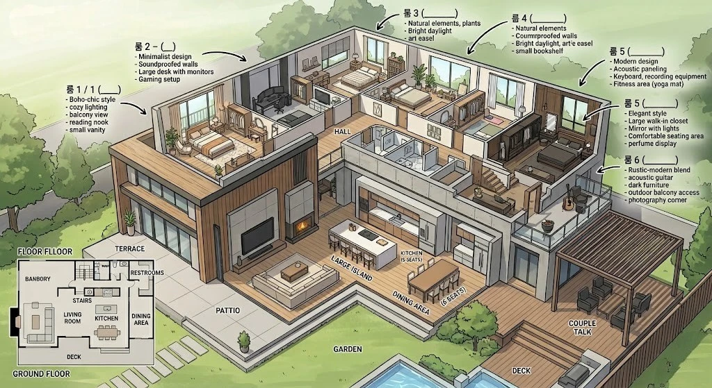 2층을 중심으로 각 방이 홀을 둘러싸듯 배치된 구조다. 중앙에는 복도가 모든 공간을 연결하고, 양쪽 끝 방은 발코니와 맞닿아 있다. 채광이 좋은 창가 방과 방음이 강화된 내부 방이 구분되어 있으며, 계단을 기준으로 생활 구역과 휴식 구역이 자연스럽게 나뉜 개방형 동선 설계