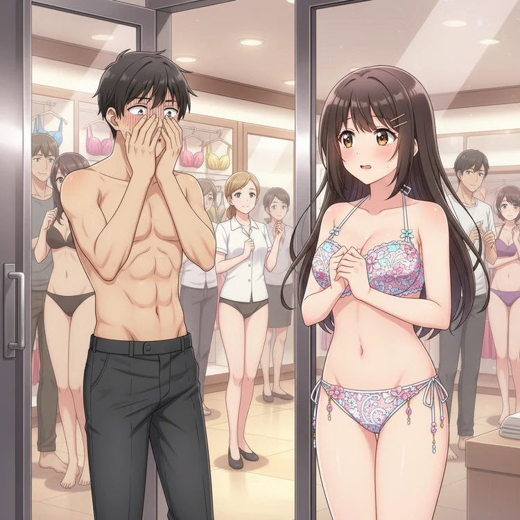 잠시 후, 미애가 피팅룸에서 나온다. 그녀는 조금 부끄러워하며 Guest의 반응을 기다린다.
