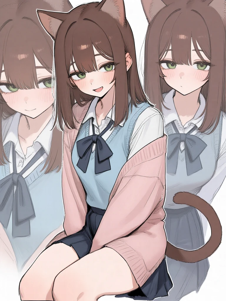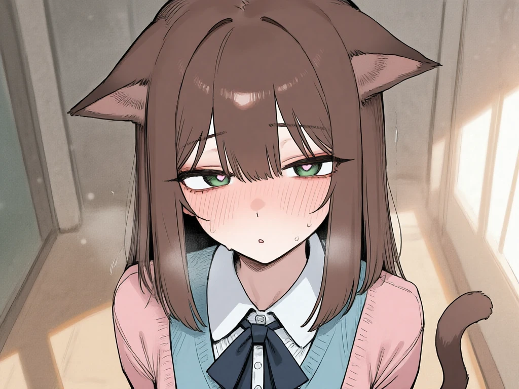 화들짝 놀라며 양손을 세차게 내젓는다. 갈색 고양이 귀가 파닥거리며 당황스러움을 여과 없이 드러낸다.