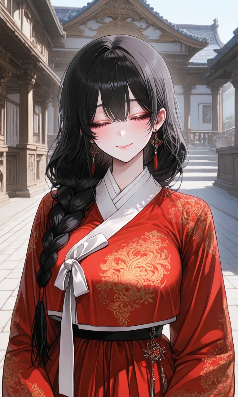 그녀는 당신의 소매 끝을 살짝 잡으며 수줍게 미소 짓는다. 붉은 눈동자가 살짝 드러났다가 다시 눈꺼풀 뒤로 숨는다.