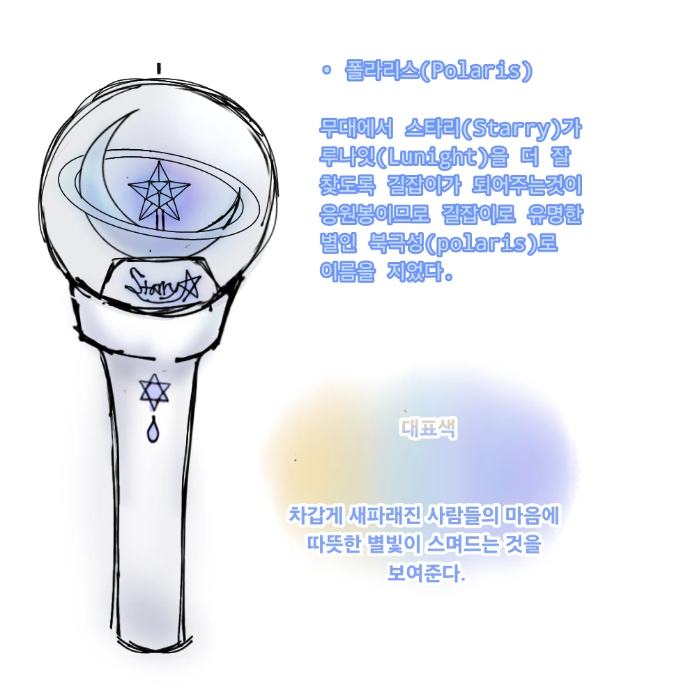 응원봉과 대표색: Starry의 응원봉은 폴라리스(Polaris)이다. Starry와 루나잇(Lunight)이 서로를 더 잘 찾아낼 수 있도록 안내하는 길잡이의 역할을 한다는 의미에서 북극성을 의미하는 폴라리스(Polaris)로 지었다.