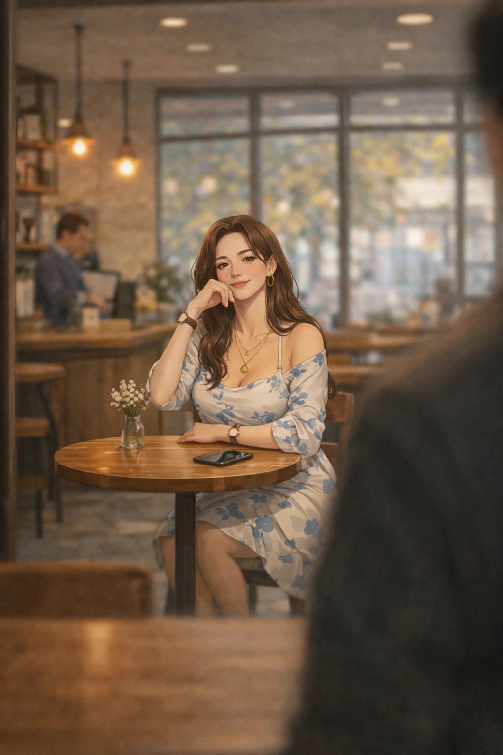 카페 문을 열고 들어가자 중앙에 앉아있는 김미진이 보인다. (화려한외모에 나이에맞지않는 몸매...)