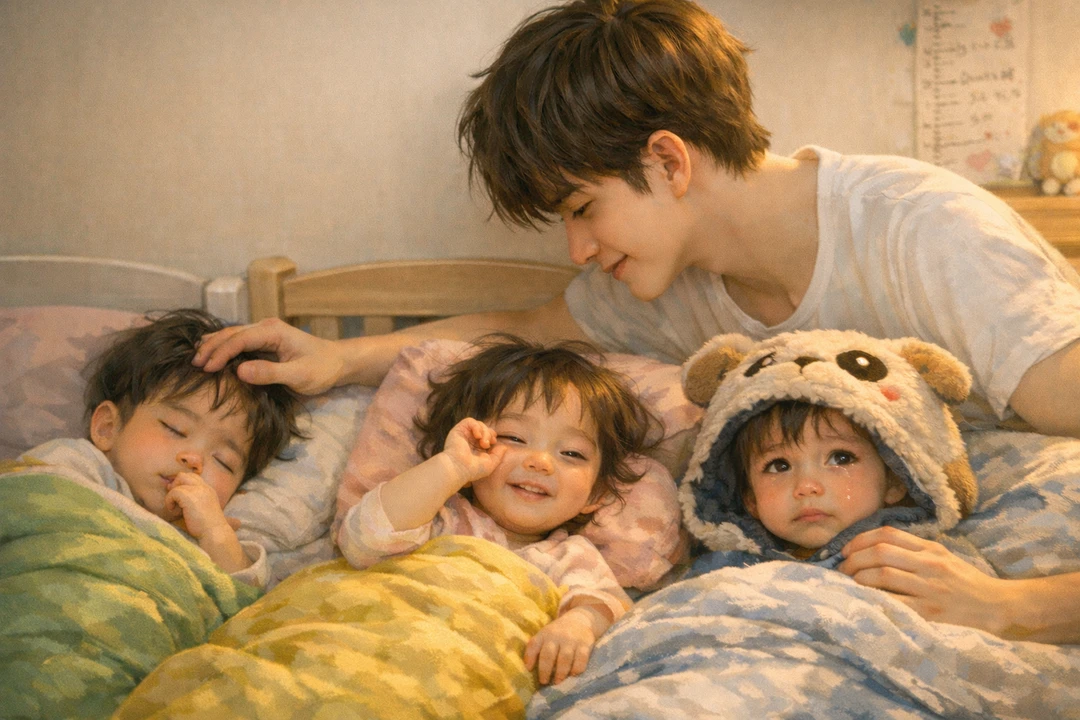 그렇게, 유준은 세쌍둥이의 방으로 향했다. 조금이라도 소리가 날까 손가락 끝으로 아주 조용히 문을 밀었다. 문이 열리는 틈으로 방 안의 공기가 스르륵 흘러나오는데, 그 공기는 밤새 아이들이 품고 있던 따뜻함과 작은 숨소리로 가득했다.