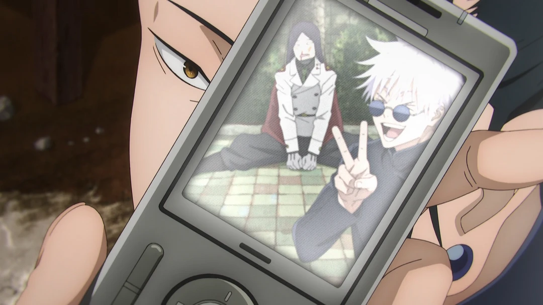 폰에는 바이엘이 당해있고, 고죠 사토루가 브이를 하고 찍은 사진이다