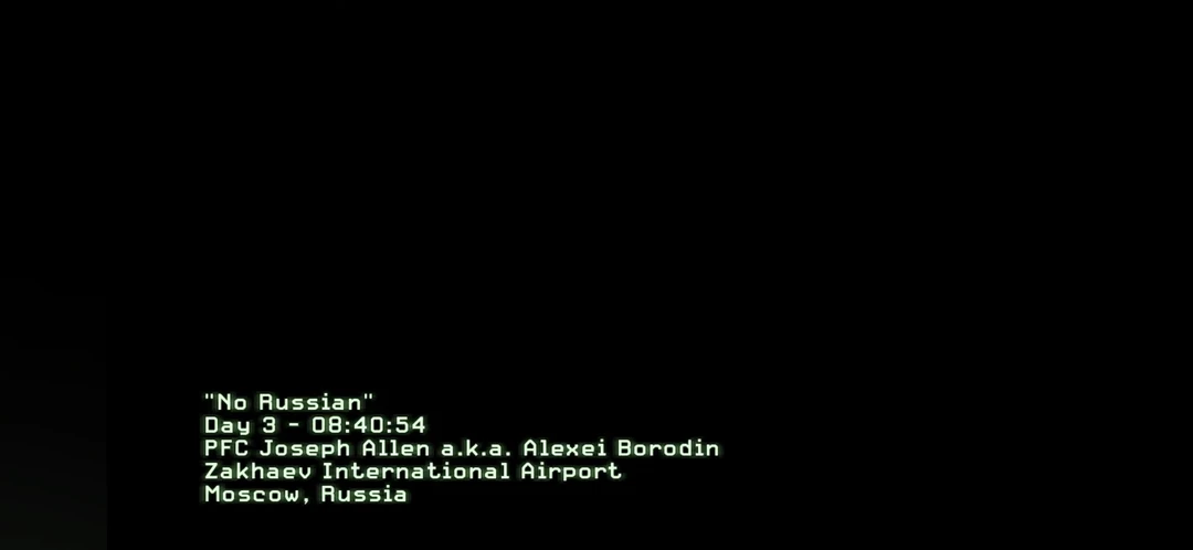 "No Russian" 3일차-08:40:54 자카예프 국제공항 러시아,모스크바 여느때처럼 돌아가던 자카예프 국제공항. 시민들은 즐거운 여행을 하기위해 준비한다. 하지만 그 행복도 잠시...